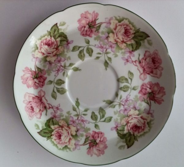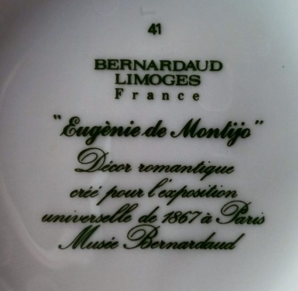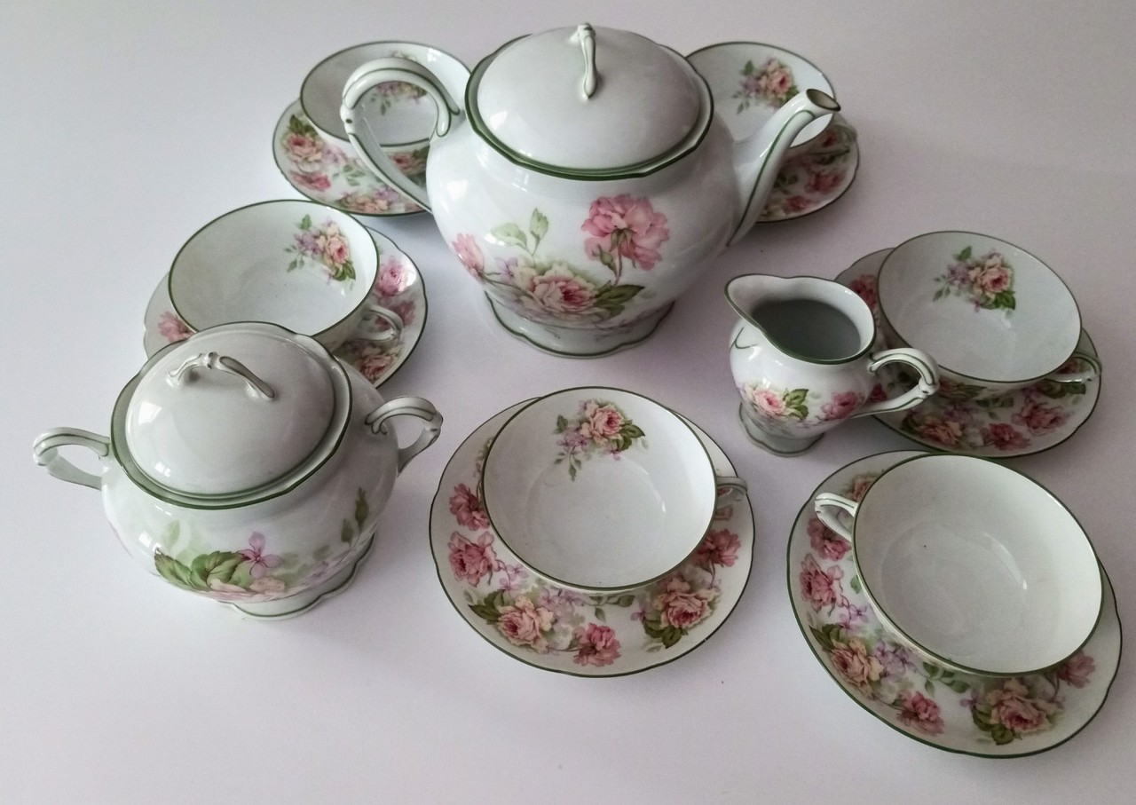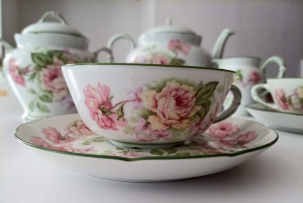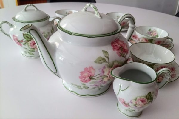 Service à thé décor floral rose « Eugénie de Montijo » : six tasses avec soucoupes, une théière, un sucrier, un pot à lait.