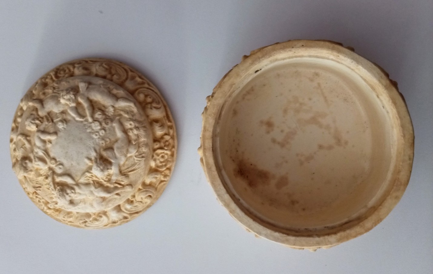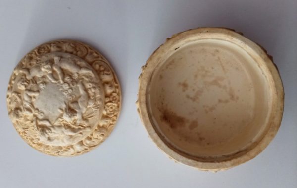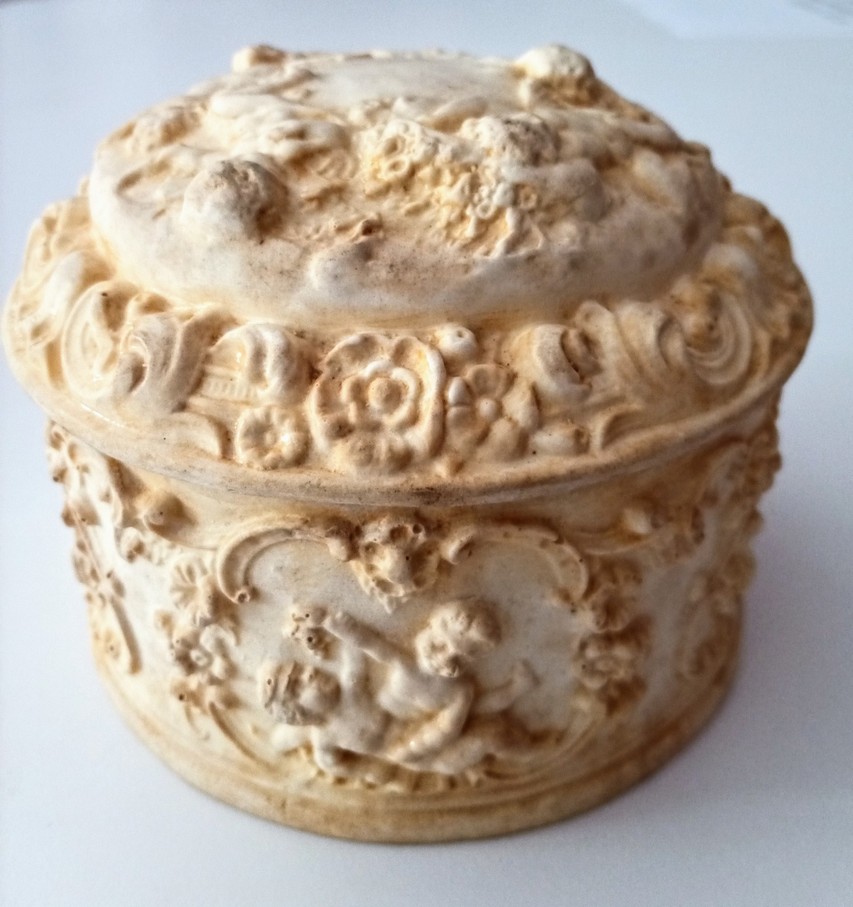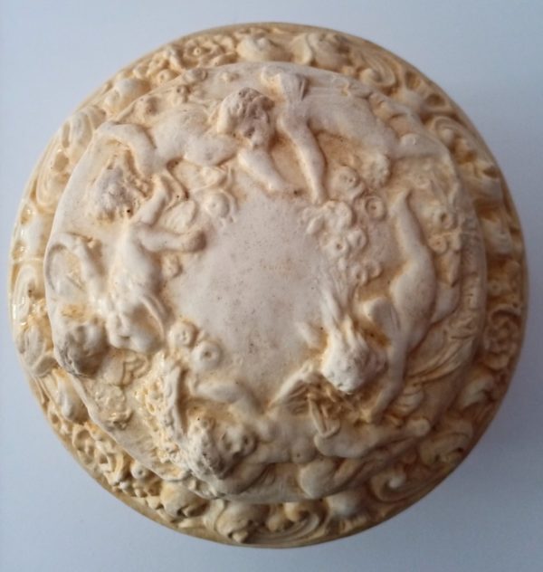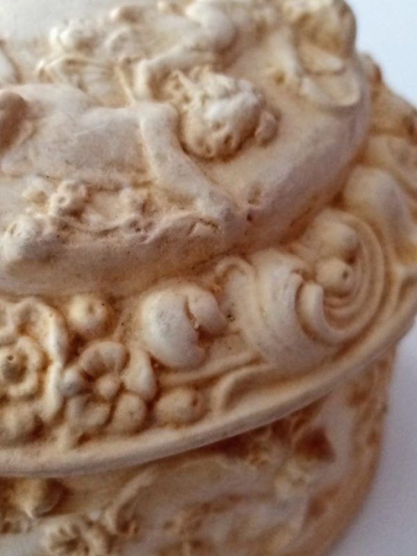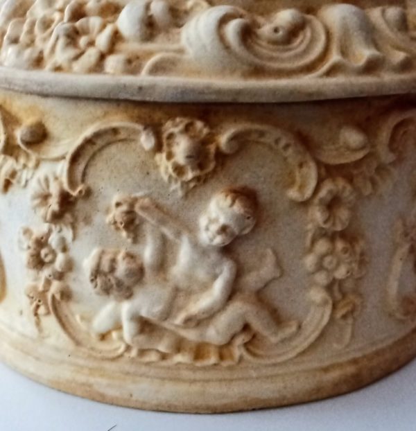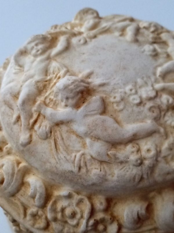 Décoré de chérubins s’ébattant dans des motifs floraux.