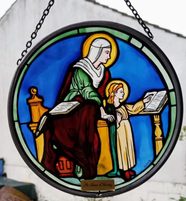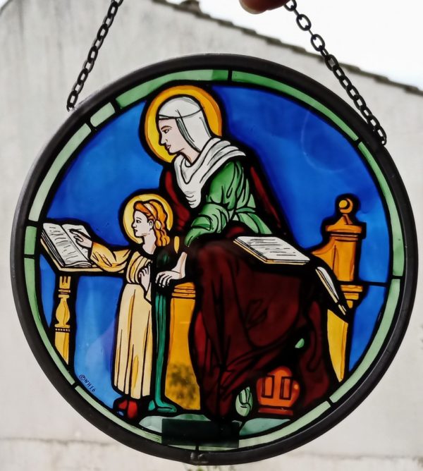 Reproduction d’un vitrail de la basilique Sainte Anne d’Auray représentant Sainte Anne enseignant les Saintes Ecritures à la Vierge Marie.